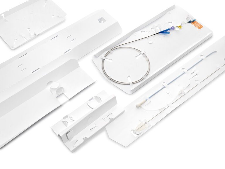 Custom Medical Backer Cards are designed to securely position individual or multiple medical devices within a pouch, in a stable, organized manner. Retainment features such as tabs, slots, folds, and straps ensure each component remains fixed in place. We manufacture backer cards from light to medium gauge HDPE, which results in a pouch/card solution that meets sustainability requirements while reducing the overall packaging footprint.
